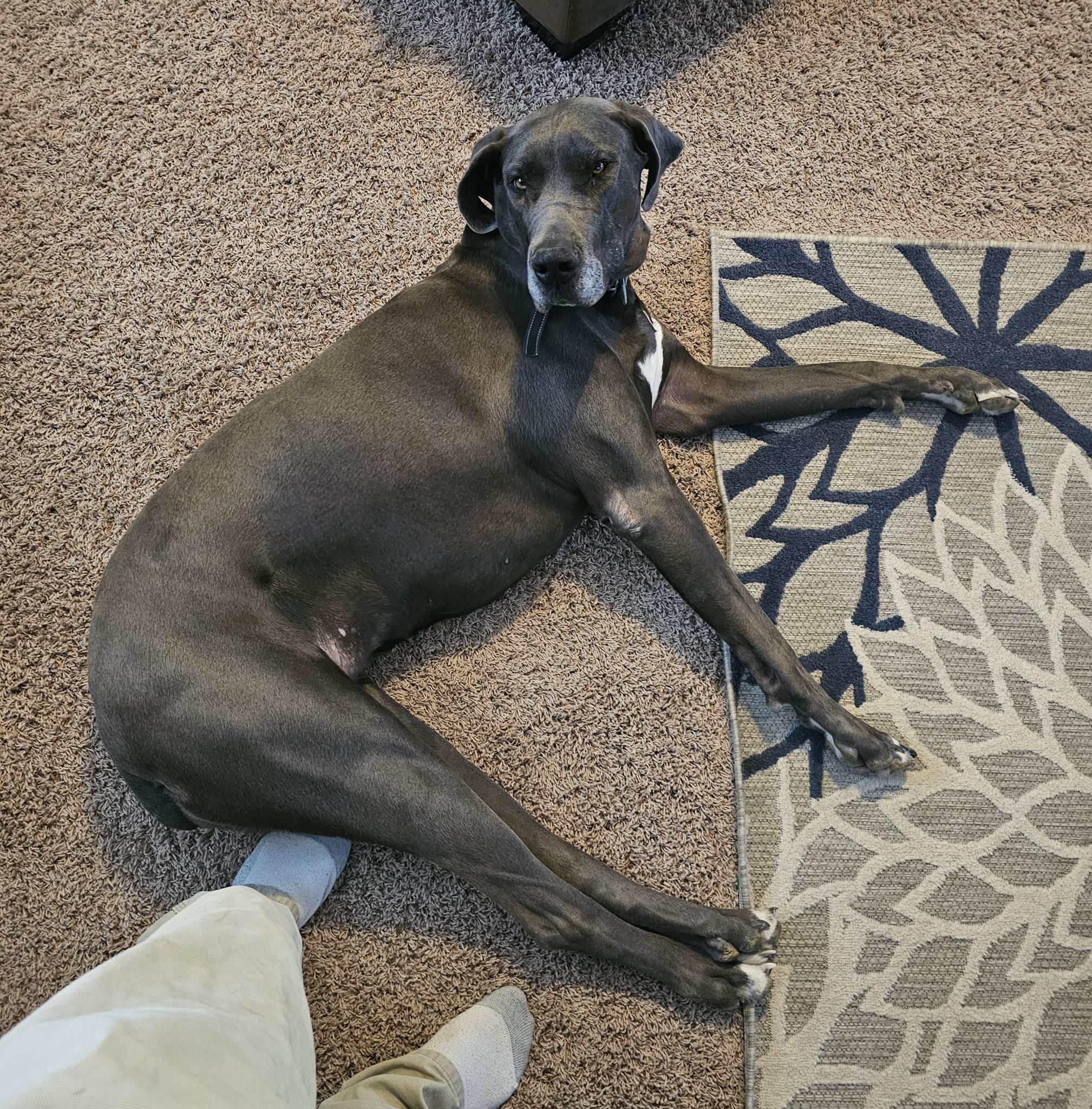 Your 140-pound lap dog in disguise… yes, she fully believes she’s a tiny puppy 😉 Oakley is a stunning blue 3 year old Great Dane with a sweet soul, a cute white blaze on her chest, and a BIG personality to match her size. She’s the kind of dog who will follow you from room to room just to be close – your shadow, your cuddle buddy, your gentle giant best friend.